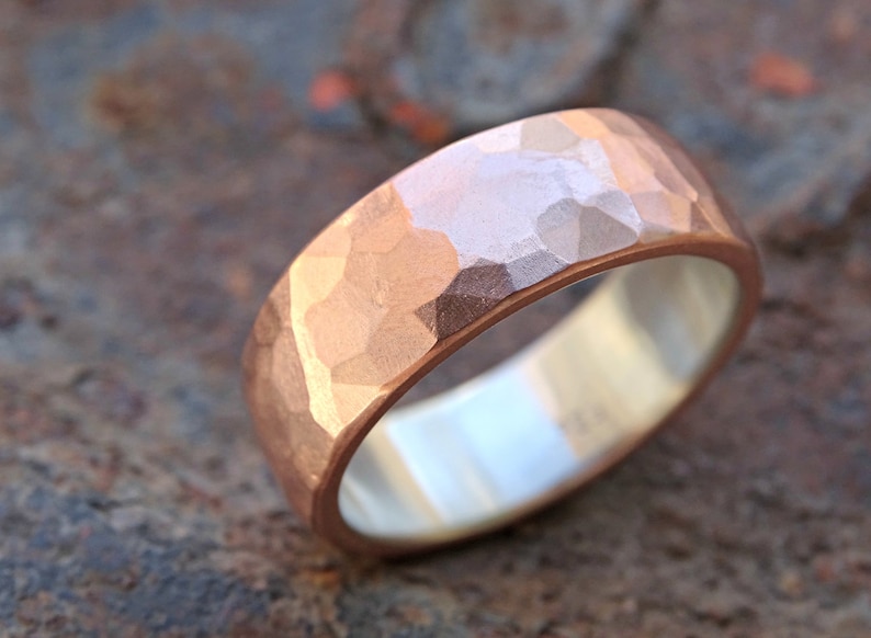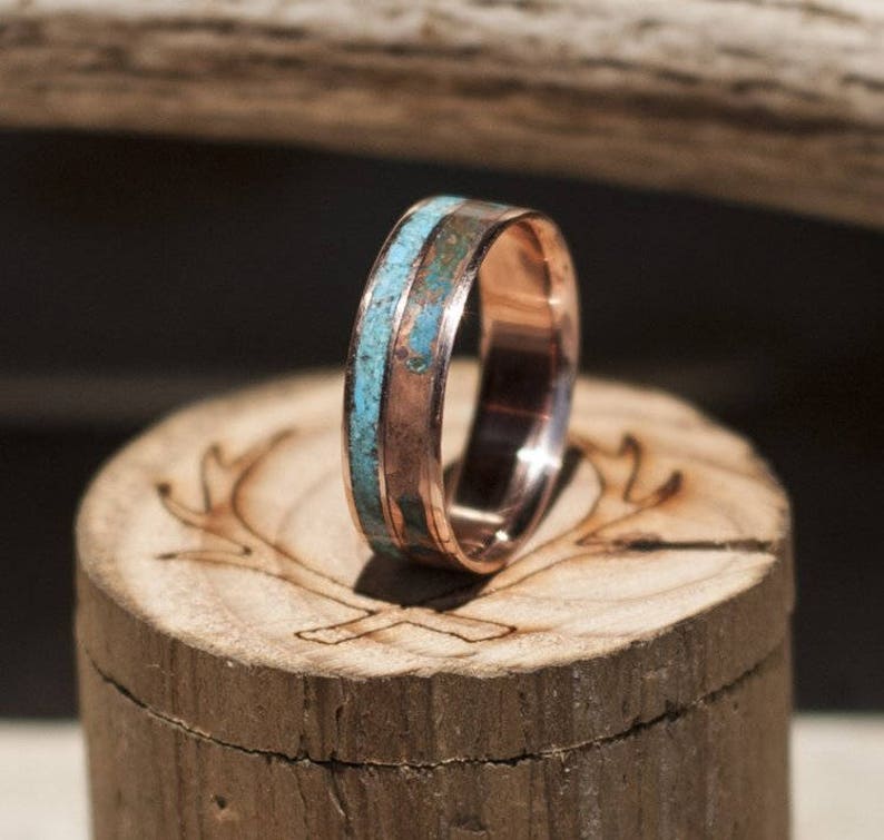 Etched Copper Wedding Band For Men. Walnut wood and copper wedding ring, rustic mens wedding band, 7 year anniversary gift for husband, men's handmade wooden jewelry. Copper wedding band, wide copper band ring, men, women, eco reclaimed recycled handmade hand forged copper ring, rustic, minimalist ring.